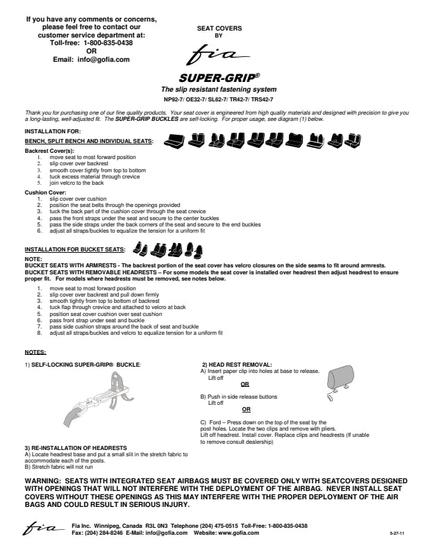 Fia SP80 Series of Custom Fit Seat Covers. Each one of these seat covers are engineered for the ultimate in seat protection. The advanced design creates a state-of-the-art interior for your truck and the commercial grade, double stitched poly-cotton fabric provides extreme durability so they will last for years. These seat covers feature full ultraviolet protection, so they keep their color and new appearance for a long period of time. If need be, these covers are even hand washable. The Sure Grip installation system allows you to put these seat covers on without any hassle. Quick release buckles, velcro, and zippers on some models make putting them on and taking them off off quick, and without use of any tools. The form fit wrap-around design with multi-directional stretch trim molds to the contours of your seat. These custom seat covers are backed by a manufacturer's limited lifetime warranty.